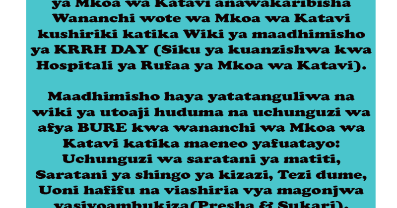 Maadhimisho haya yatatanguliwa na wiki ya utoaji huduma na uchunguzi wa afya BURE kwa wananchi wa Mkoa wa Katavi katika maeneo yafuatayo: Uchunguzi wa saratani ya matiti, Saratani ya shingo ya kizazi, Tezi dume, Uoni hafifu na viashiria vya magonjwa yasiyoambukiza(Presha & Sukari).